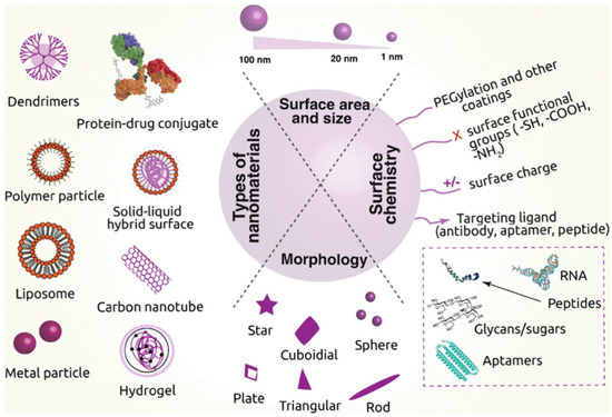 Scheme of the different types of nanoparticles and their main characteristics, including size, shape, coating, surface chemistry, and target. Image from Navya et al. [24].