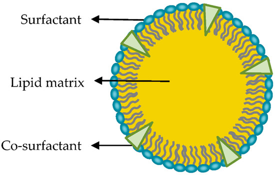 SLNs are colloidal particles of submicron size, from 50 to 1000 nm in diameter. They consist of a matrix of crystalline lipids that are solid at ambient temperature and some tensoactive agents that allow them to accommodate molecules between their chains of fatty acids, either in the lipid nucleus or on the surface (Figure 4). They may be spherical, ellipsoidal, or disc-like. The surface charge of an SLN is determined by its constituents and the pH of the surrounding medium [27,29,30].