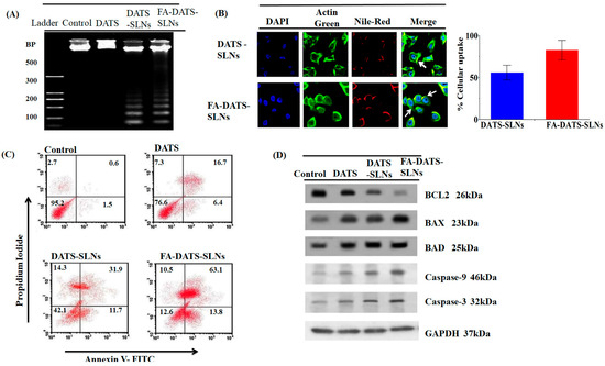 (A) DNA fragmentation of the MDA-MB-231 cell line treated with DATS, DATS-SLNs, and FA-DATS-SLNs. (B) Cellular internalization of DATS-SLNs and FA-DATS-SLNs in the MDA-MB-231 cells. (C) Apoptosis in MDA-MB-231 cells treated with DATS, DATS-SLNs, and FA-DATS-SLNs. (D) Blots of Bcl2, Bax, and Caspases 3, 9 in the MDA-MB-231 cells treated with FA-DATS-SLNs, DATS-SLNs, and DATS. Image from De, A et al. [54].