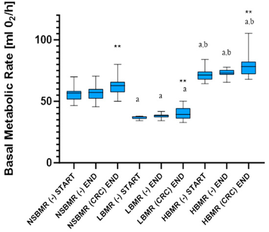 Basal metabolic rate values (start and end) in mice divergently selected for HBMR LBMR NSBMR in two experimental groups: without CRC (−) and with CRC. The results are expressed as the mean ± SEM for each group. ** p < 0.01 vs. animals without CRC (−) in each tested line, a p < 0.05 vs. NSBMR start/end (−) and (CRC) end, respectively, b p < 0.05 vs. LBMR start/end (−) and (CRC) end, respectively.
