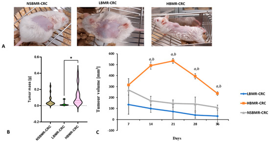 Image of tumor size (A), tumor mass at 36 days (B), and tumor growth (C) changes in studied groups. The results are expressed as the mean ± SEM for each group. * p < 0.05, a p < 0.01 vs. NSBMR-CRC, b p < 0.01 vs. LBMR-CRC.