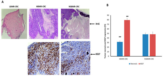 The histopathological analysis revealed significant differences in the characteristics of CRC development and growth in the tested mouse lines (Figure 3A). The H&E test clearly indicated the development of CRC in the harvested tumors in the HBMR-CRC and NSBMR-CRC groups. G3-type poorly differentiated colorectal neoplasia masses were found in both metabolic lines. However, the analysis of tissues from LBMR-CRC mice did not confirm CRC structures and morphologically pointed rather to something resembling fibrous connective tissue that underwent a significant hyalinization process. Due to the volume reduction of the CRC tumors during the experiment, the degree of necrosis in the collected tissues was also estimated. Neoplasm necrosis is one of the prognostic indicators, particularly in aggressive tumors [34]. Accordingly, it has been suggested that a higher degree of necrosis may indicate more aggressive tumor growth and, thus, a worse prognosis for the patient [35]. In addition, necrosis is often associated with an inflammatory response aimed at removing dead cells. The analysis of identified tumors showed that in the HMBR-CRC group, the degree of tumor necrosis was estimated at 31.4%, whereas in the NSBMR-CRC group, it was significantly higher (48.1%) (Figure 3B). As was discussed above, the significant decrease in tumor volume observed in high-BMR mice after the 21st day of the experiment may be attributed to a necrotic process.