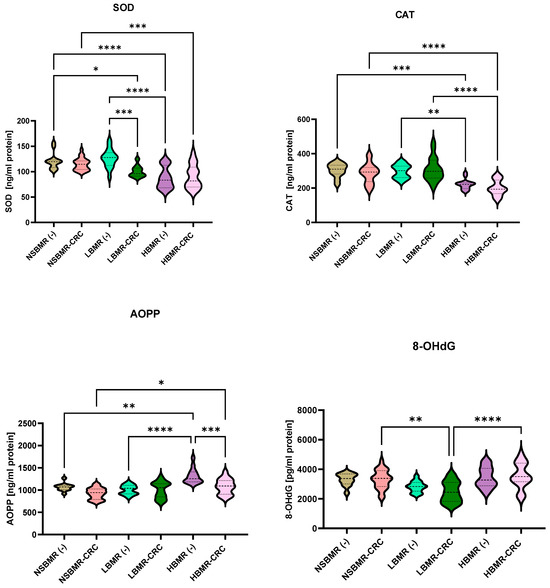 The analysis of oxidative status in the livers of animals without CRC clearly showed that the highest AOPP concentration was exhibited by mice with high BMR (1311.0 ng/mL protein) compared to LBMR (1006.0 ng/mL protein). Our study demonstrated that the concentration of 8-OhdG was significantly higher in the HBMR(−) and NSBMR(−) groups (3437.0 and 3314.0 ng/mL protein, respectively) compared to LBMR(−) animals (2818.0 ng/mL protein). The development of CRC resulted in a significant decrease in CAT concentration in HBMR-CRC mice (201.5 ng/mL protein) compared to NSBMR-CRC (286.9 ng/mL protein, p < 0.0001) and LBMR-CRC (309.0 ng/mL protein, p < 0.0001). A significant (p < 0.001) decrease in SOD concentration was noticed in the LBMR-CRC group compared to the LBMR(−) mice. It is important to note that the development of CRC resulted in a slight increase in 8-OhdG in HBMR-CRC and NSBMR-CRC mice when compared to their respective groups without CRC. Furthermore, AOPP levels were found to be significantly reduced in the HBMR-CRC group compared with those of the HBMR(−) animals and were found to be significantly higher compared with those of the NSBMR-CRC group.