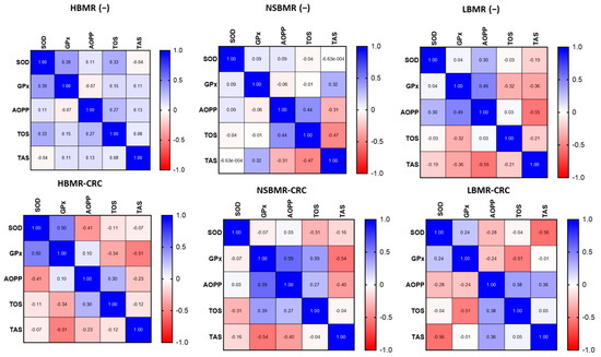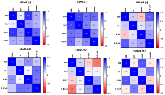 The analysis of antioxidant and oxidant status in the liver of the experimental groups showed a high correlation between 8-OhdG and AOPP (r = 0.59) but a weak relation between SOD and CAT (r = 0.09) in HBMR(−) animals (Figure 5). On the other hand, the LBMR(−) group exhibited a positive correlation between SOD and CAT concentrations, indicating a high antioxidant status in these animals (r = 0.73). In the NSBMR(−) group, we noted a correlation between 8-OhdG and AOPP (r = 0.38) and between SOD and CAT (r = 0.2). The presented results suggest a high oxidative status in the livers of HBMR(−) mice, while a high antioxidant status was attributed to the LBMR(−) group.
