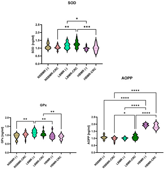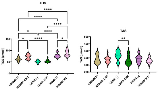 Furthermore, an analysis of the total oxidative (TOS) and antioxidant (TAS) statuses of the serum of the tested animal groups revealed significant differences in values between the tested animal lines (Figure 6, Figure 7 and Figure 8). The results showed that HBMR mice both without and with CRC had the highest levels of TOS (respectively: 78.4 µmol/mL and 87.9 µmol/mL), AOPP (respectively: 1.9 ng/mL and 1.8 ng/mL) in their serum, compared to NSBMRand LBMR animals. Furthermore, the concentration of TOS in the experimental groups with CRC cells in all tested animal lines was significantly higher than in their respective groups without CRC(−). Regarding antioxidant status, the highest level of TAS was detected in the LBMR group without CRC (365.6 µmol/mL), which is also related to the high concentration of antioxidant enzymes such as SOD (1.2 ng/mL) and glutathione peroxidase (GPx) (1.1 ng/mL) in the tested animal line.