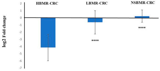 Keap1 expression in livers of studied animal groups with CRC. The results are presented as log2 delta-corrected Ct values. Differences statistically significant: **** p < 0.001 vs. HBMR-CRC group.