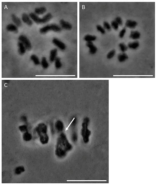 Spreads and squashes of Rhombodera megaera spermatocytes were imaged in meiosis I and meiosis II to determine the chromosome number and the sex determination mechanism. Spread and squashed spermatocytes (>50) generated from three males were used to determine chromosome structure and number. We observed that spermatocytes that develop into female-determining sperm contain 14 chromosomes (Figure 2A), spermatocytes that develop into male-determining sperm contain 13 chromosomes (Figure 2B), and that meiosis I spermatocytes have a sex trivalent (Figure 2C, arrow). These chromosome numbers indicate that R. megaera has a diploid chromosome number of 2n − 27 in males. These findings are consistent with a previously reported karyotype analysis of the subfamily Hierodulae [].