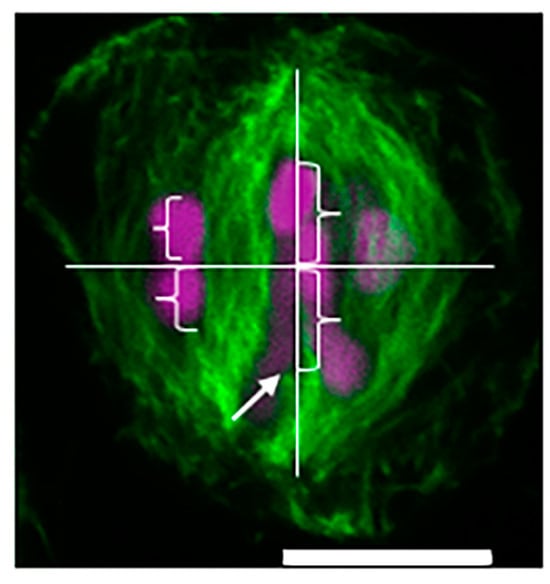 - Fabig, G.; Kiewisz, R.; Lindow, N.; Powers, J.A.; Cota, V.; Quintanilla, L.J.; Brugués, J.; Prohaska, S.; Chu, D.S.; Müller-Reichert, T. Male meiotic spindle features that efficiently segregate paired and lagging chromosomes. eLife 2020, 9, e50988. [Google Scholar] [CrossRef]