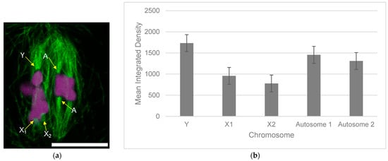 A total of 75 cells from metaphase I were imaged. Imaging of stained cells was performed using a 100X, 1.4 NA oil immersion objective on a Leica SP5 Spectral Systems confocal microscope. Z-stacks were collected with 0.25 μm intervals. Images were analyzed using Adobe Photoshop CC 2023. Cells in which all three kinetochore ends of the trivalent were in focus in the same field of view were selected for further analysis. Photos were rotated so that each microtubule bundle associated with each chromosome of the sex trivalent was vertically centered and subjected to integrated density analysis. A standardized pixel box with the dimensions of 2X5 was created for all measurements and placed 3 pixels above the tip of each trivalent chromosome to capture fluorescence intensity. Three measurements of background intensity were taken for each cell and average background intensity was subtracted from measurements of the density of microtubule bundles. Integrated density for Y, X1, X2, and autosomal microtubule bundles were averaged with standard deviations for 12 cells.