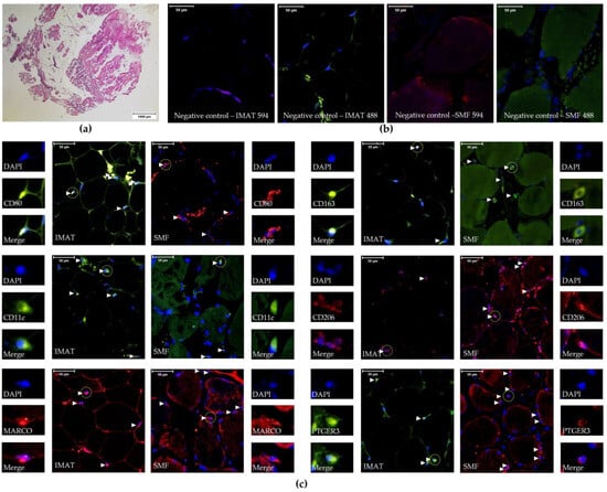 Representative images of skeletal muscle tissue samples. All images were obtained from participant P10. (a) The image of skeletal muscle tissue after HE staining indicating areas of SMFs and IMATs. (b) Immunofluorescence images of 230 µm × 260 µm fields of view after co-staining with DAPI and secondary antibodies as negative controls. (c) Immunofluorescence images of 230 µm × 260 µm fields of view after co-staining with primary antibodies against CD80, CD11c, MARCO, CD163, CD206, or PTGER3 with the corresponding secondary antibodies and DAPI. The small panels on the left show magnified single-cell images (dashed line circles) with DAPI (blue, top), IgG594 (red, middle), or IgG488 (green, middle) filters. DAPI and IgG594 or DAPI and IgG488 were merged (Merge, bottom) to determine the specificity of the detected signals. Verified positive cells are labeled with white arrowheads.