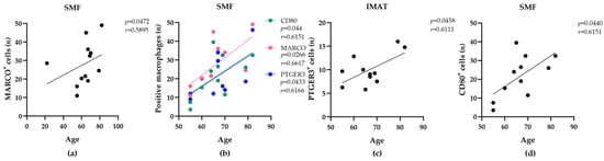 We determined the number of macrophages positive for each marker that were attached to SMFs or IMATs within two microscopic fields of view (0.24 mm2). The number of macrophage phenotypes (CD11c+, CD80+, CD163+, CD206+, MARCO+, or PTGER3+) between the SMFs or IMATs of the participants varied substantially (36- or 9-fold between SMFs and IMATs, respectively). However, we detected significant correlations between donor age and the abundance of SMF-resident or IMAT-resident CD80+, MARCO+, or PTGER3+ macrophages by further statistical analyses (Figure 2a–c). For example, the number of SMF-resident MARCO+ macrophages was significantly correlated with the age of the donors (Figure 2a, r = 0.59, p < 0.05). Among the participants older than 55 years, age was also correlated with increasing numbers of SMF-resident CD80+ (r = 0.62, p < 0.05) or PTGER3+ (r = 0.62, p < 0.05) macrophages (Figure 2b) and IMAT-resident PTGER3+ macrophages (r = 0.61, p < 0.05) (Figure 2c). These positive correlations suggested a general increase in the abundance of MARCO+, CD80+, and PTGER3+ macrophages with age. Moreover, independent of donor age, body mass index (BMI) was positively correlated with the number of SMF-resident PTGER3+ macrophages (Figure 2d, r = 0.68, p < 0.05). These findings suggest that the number of PTGER3+ macrophages may rise in human skeletal muscle with increasing age and BMI.
