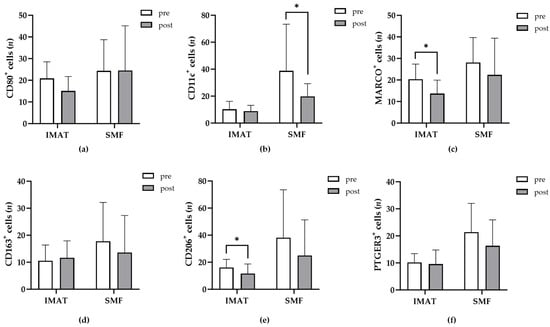 Numerous studies have suggested that TRMs can undergo proliferative and functional changes in animal models []. Here, we used a native human skeletal muscle tissue model to compare the temporal variations in SMF- and IMAT-resident macrophage populations in vitro. The donor tissue samples were maintained in vitro for 9 or 11 days and analyzed as described above (2.3.). We determined the number of CD80+, CD11c+, MARCO+, CD163+, CD206+, or PTGER3+ macrophages in SMFs and IMATs from all samples after 9 or 11 days (post) and compared them to the corresponding numbers that were obtained immediately after surgery (pre) (Figure 3a–f, respectively). Statistical analysis revealed no significant correlations between donors’ characteristics such as age or BMI and the changes in the abundance of phenotypes among IMATs or SMFs. Also, the number of CD80+, CD163+, or PTGER3+ TRMs in SMFs and IMATs did not change significantly (Figure 3a,d,f).