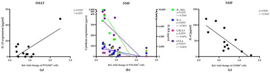 Next, we analyzed the expression of multiple cytokines/chemokines to evaluate the possible link between the levels of inflammatory proteins and the relative fold changes in the abundance of specific phenotypes among SMF- or IMAT-resident macrophage. To obtain the relative fold changes, we normalized the numbers of each phenotype in SMFs and IMATs after maintenance to their corresponding numbers immediately after surgery. Thus, values higher or lower than one signify increases or decreases in macrophage abundance, respectively (Figure 4a,b, x-axis). Remarkably, we observed a positive correlation between the expression level of IL-13 and the relative fold increase in IMAT-resident PTGER3+ macrophages (Figure 4a). In SMFs, however, the expression levels of four chemokines, IL-1RA, IL-6, IL-8 and MIP-1 beta, were correlated with decreases in the number of PTGER3+ macrophages (Figure 4b). These findings suggested that the number of PTGER3+ macrophages in adjacent SMFs and IMATs may be regulated by different sets of chemokines. IL-6 levels were correlated with a decrease in the number of SMF-resident CD206+ macrophages in our samples (Figure 4c). However, we detected no significant correlations with other cytokines/chemokines (Supplementary Materials, Table S1).