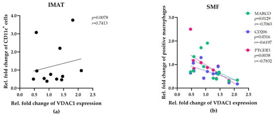 The VDAC1 expression level is linked to mitochondrial mass in skeletal muscle fibers and adipose tissues [,]. To compare the means of metabolic activities during the tissue maintenance in vitro, VDAC1 levels in SMFs and IMATs were determined and normalized to the number of muscle fibers or adipocytes, respectively. VDAC1 was significantly higher expressed in SMFs than in IMATs, but its expression in IMAT was increased during the tissue maintenance in vitro (Supplementary Materials, Figure S1). Statistical analyses revealed opposite correlations between VDAC1 expression and the relative fold changes in IMAT and SMF macrophage numbers in vitro (Figure 5a,b, Supplementary Materials, Table S2). In IMATs, increasing numbers of CD11c+ macrophages were positively correlated (p = 0.0078, r = 0.7413) with VDAC1 expression (Figure 5a). In SMFs, increasing numbers of MARCO+, CD206+, and PTGER3+ macrophages were negatively correlated (p = 0.0129, r = −0.7063, p = 0.0316, r = −0.6197, and p = 0.0038, r = −0.7832, respectively) with VDAC1 expression (Figure 5b). Thus, the mitochondrial mass in IMATs and SMFs may contribute to the abundance of resident macrophages.