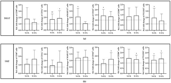 FAs exert disparate effects on SMF- and IMAT-resident macrophages. Adjacent tissue samples from all donors (n = 12) were maintained in vitro for 9 or 11 days with or without U-FAs (C16[1]c and C18[2]c) or S-FAs (C16 and C18). The number of cells in FA-stimulated tissues was normalized to the corresponding number of cells in untreated tissues to calculate the relative fold change in response to S-FAs or U-FAs. For comparison, the relative fold change in untreated tissues was set to 1 (dashed line). The diagrams show the relative fold changes in cell numbers (y-axis) for the specified macrophage phenotypes (top of each diagram) after treatment with S-FAs or U-FAs (x-axis) in IMATs (a) or SMFs (b) of the donors (n = 12). One-sample t tests or the Wilcoxon signed-rank test was employed to assess the significance of the detected differences. p ≤ 0.05 (*), p ≤ 0.01 (**).