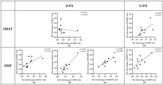 The results in Figure 6a,b revealed that S-FAs and U-FAs can equally increase the numbers of IMAT-resident CD11c+ macrophages and SMF-resident PTGER3+ macrophages. This prompted us to investigate whether the responses of distinct macrophage phenotypes are distinctly coordinated in SMFs and IMATs. Therefore, we examined potential correlations between the number of different macrophage phenotypes in response to S-FAs and U-FAs (Figure 7). In IMATs, the increase in CD80+ macrophages was negatively correlated with CD11c+ macrophages in response to S-FA (p = 0.0387, r = −0.6378) but positively correlated with PTGER3+ macrophages in response to U-FA (p = 0.0202, r = 0.7333) (Figure 7a,b). These results indicated that S-FAs and U-FAs can differentially affect the macrophage population in IMATs. Most importantly, however, S-FAs can exert apposite effects on IMATs and SMFs (Figure 7a,d). The S-FA mediated increases in CD80+ and CD11c+ macrophages were positively correlated in SMFs (p = 0.0322, r = 0.6560) but negatively in IMATs (p = 0.0387, r = −0.6378) (Figure 7a,d). Together, these results highlight the importance of tissue residence for the dynamic responses of resident macrophages independent of their marker profile.