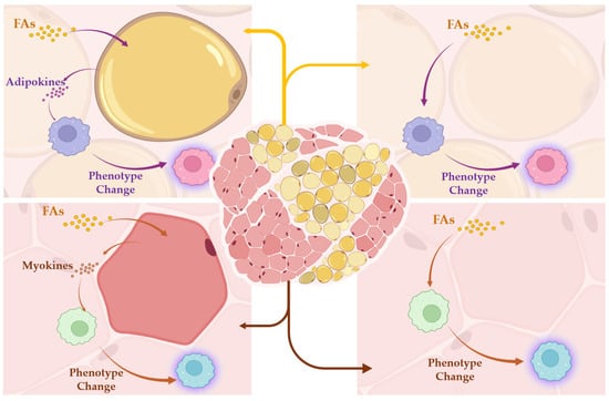 IMAT is a depot of adipocytes that gradually accumulates between myofibers as a result of increased obesity []. Emerging evidence shows that IMAT expansion is closely linked to increased risk for developing type 2 diabetes (T2D) and insulin resistance as well as to aging and neuromuscular diseases that lead to reduced muscle mass [,]. The abundance of IMAT-resident macrophages was found to be increased in obese individuals []. Coculture experiments in vitro have shown that fatty acids (FAs) secreted from adipocytes increase glucose metabolism in the mitochondria of in vitro-differentiated myotubes []. In fact, several physiological factors, including body energy levels, exogenous energy from food, and the level of oxidative stress can affect mitochondrial activity in skeletal muscle []. Moreover, adipose tissue can secrete many hormones, adipokines, lipids, and miRNAs that also act on adjacent skeletal muscle cells []. Adipokines represent a group of cytokines/chemokines that regulate important metabolic or inflammatory pathways in adipose tissue associated with obesity and obesity-related disorders []. Similarly, skeletal muscle fibers secrete myokines that are involved in the autocrine regulation of metabolism in muscles and in para- or endocrine regulation of other tissues, including adipose tissue []. The increasing number of adipokines and myokines exposes intriguing overlaps, including interleukin (IL)-6, monocyte chemoattractant protein-1 (MCP-1), and tumor necrosis factor (TNF) alpha.