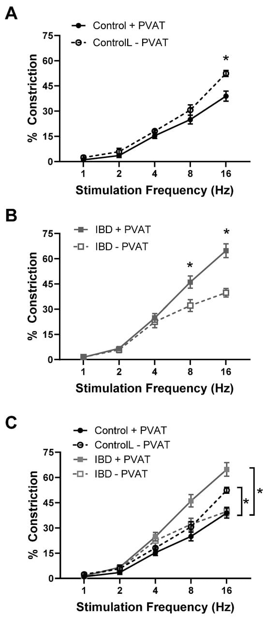 PVAT becomes pro-contractile in mesenteric arteries with inflammatory bowel disease (IBD). Data are mean ± SE for % constrictions to electrical field stimulation (EFS, 1–16 Hz) of cannulated, pressurized mesenteric arteries with (+PVAT) and without (−PVAT) perivascular adipose tissue (PVAT) from Control and IBD mice. PVAT presence reduces electrical field stimulation (EFS)-induced constriction in Control arteries (A,C) but increases constriction in IBD arteries (B,C). n = 4–6 per group, * = p < 0.05 for +PVAT vs. −PVAT (A,B) or Control vs. IBD (C).