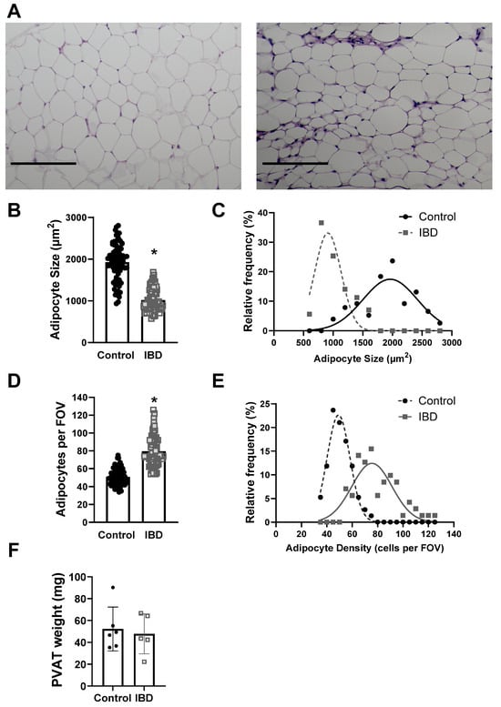 To determine whether structural changes to PVAT adipocytes occur alongside functional alterations in IBD, the adipocyte size and density were measured in H&E stained PVAT sections from Control and IBD mice. Adipocytes were larger in Control vs. IBD (1926 ± 51 vs. 1018 ± 32 μm2, Figure 2A,B) with decreased density (50.7 ± 1.0 vs. 79.4 ± 2.0 cells/field, Figure 2A,D), suggesting adipocyte hyperplasia. Frequency histograms for size and density show that IBD is also associated with an increase in the distribution of size and density (Figure 2C,E). IBD did not alter total PVAT weight (Figure 2F) or body weight, suggesting changes are not simply due to a decrease in the amount of PVAT present around mesenteric arteries. IBD was also associated with an increase in stromal vascular fraction, as shown by increased purple staining (Figure 2A), suggesting an increase in non-adipocyte cells in PVAT with IBD.