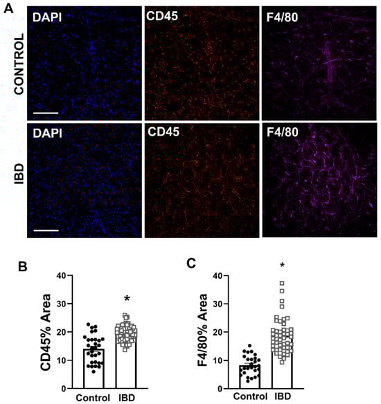 The analysis of PVAT H&E sections further suggested an expansion of the stromal vascular fraction with IBD, and we confirmed an increase in CD45+ leukocytes and F4/80+ macrophages in PVAT via the quantitative analysis of fluorescent immunolabeling (Figure 3). Again, this is consistent with findings in the creeping fat of human IBD patients that has an expanded immune cell population, including M1 and M2 macrophages []. Results are also consistent with our previous findings of increased macrophages in the adventitial wall of mesenteric arteries with IBD, which were linked to impaired sensory nerve-mediated vasodilation []. Outside of IBD, changes in the immune cell populations of PVAT have been documented across a number of diseases. Focusing on macrophages, increases have been demonstrated in mesenteric PVAT in obesity [] and hypertension []. Macrophage expansion in aortic PVAT is also well documented in atherosclerosis [], which is a known IBD comorbidity. The present data in light of published work suggest, albeit not definitively, that macrophage accumulation in mesenteric PVAT with IBD is linked to the loss of anti-contractility. Additional future studies further characterizing macrophage subpopulations and investigating the vasomotor consequences of macrophage depletion are needed to define more concrete mechanistic links.