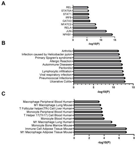 Enrichment analysis of differentially expressed genes from cytokine and chemokine PCR arrays. Data are the top transcription factors (A), disease associations (B) and cell type associations (C) based on analysis of PCR array genes with fold changes > 1.5, <0.5 or p < 0.05.