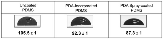 Effect of PDA on PDMS hydrophobicity. Pictures of water droplets and water contact angle measurements of uncoated PDMS, PDA-incorporated PDMS, and PDMS spray-coated with PDA. Each data represents the mean ± SD of three independent measurements.