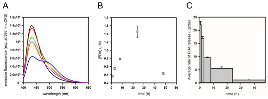 To assess PDA release kinetics, pieces of PDA spray-coated PDMS were placed at the basis of cylindric containers (i.e., wells of a 6-well culture plate). A fixed volume of PBS was added, and the plate was put under agitation on an orbital shaker. At given times (1, 3, 8, 24, and 48 h), PBS was replaced with fresh buffer and the recovered solution was used to determine the amount of released PDA for each given time interval. This buffer exchange ensured that the release rate was not limited by PDA solubility and concentration in the medium. In Figure 3, ADIFAB spectra (A), the corresponding free PDA concentrations (B) and the average rates of PDA release (C) are reported for each time interval.