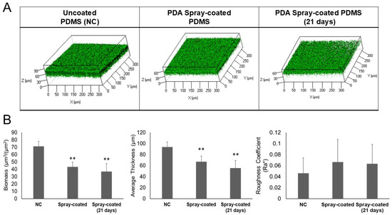Evaluation of biofilm formed in convertible flow cells on PDMS surfaces. (A) CLSM analysis of S. epidermidis RP62A biofilms formed on uncoated PDMS (NC), PDA-incorporated PDMS and PDA spray-coated PDMS. Bi-dimensional and three-dimensional biofilm structures were obtained using the LIVE/DEAD® Biofilm Viability Kit. (B) COMSTAT quantitative analysis of biomass (µm3/µm2), average thickness (µm), and roughness coefficient (Ra*) of biofilms formed on uncoated PDMS (NC), PDA-incorporated PDMS and PDMS spray-coated with PDA. Differences in mean values were compared to the uncoated PDMS (NC) values and considered significant when p < 0.05 (** p < 0.01, *** p < 0.001) according to the Student’s t-test.