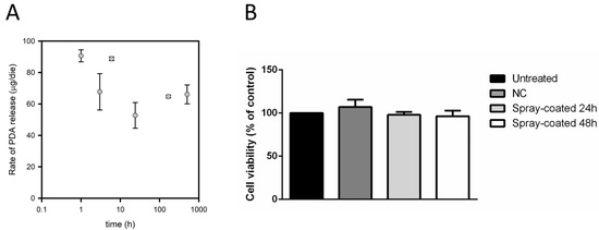 To further investigate a possible use of the PDA spray-coated PDMS for medical devices, its biocompatibility was evaluated. The effect on cell viability was evaluated on immortalized human keratinocytes (HaCaT). 24 h after seeding, cells were incubated with uncoated PDMS, or with PDA spray-coated PDMS for 24 or 48 h. At the end of incubation, cell survival was determined by the MTT assay. As shown in Figure 5B, no effect on cell viability was observed when cells were incubated with either uncoated PDMS or PDA spray-coated PDMS, independently from the time of the incubation (24 and 48 h), thus supporting its biocompatibility. No direct correlation between contact angle, roughness and biocompatibility was found considering uncoated, PDA-incorporated and spray-coated PDMS.