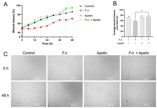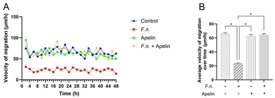 After incubation of injured PDL cell monolayers with F. nucleatum and/or apelin, wound closure was analyzed over 48 h. As shown in Figure 1A–C, after 48 h, the percentage of cell-free area was highest in the monolayers incubated with F. nucleatum alone, i.e., F. nucleatum inhibited wound closure. Apelin alone had no effect on the wound healing. When the F. nucleatum-incubated monolayers were simultaneously treated with apelin, the wound closure was significantly (p < 0.05) improved compared with the monolayers treated with F. nucleatum alone, i.e., apelin was able to significantly (p < 0.05) antagonize the inhibitory effect of F. nucleatum. The mean migration velocity was significantly (p < 0.05) lower in the monolayers incubated with F. nucleatum alone than in all other groups (Figure 2A,B). The cells of the control, apelin and combined F. nucleatum and apelin groups migrated at a similar average velocity.