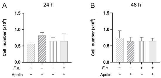Since the wound closure also depends on the cell number, the effects of F. nucleatum and/or apelin on the number of cells were evaluated. As shown in Figure 3A,B, F. nucleatum and/or apelin had no significant effects on the PDL cell numbers after 24 h and 48 h.