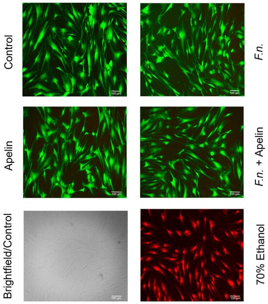 Viability of PDL cells in the presence and absence of F. nucleatum (OD660: 0.025) and/or apelin (1 ng/ml) in vitro at 48 h, as analyzed by live and dead assay and light microscopy. Unfiltered image (brightfield) and positive control for dead cells (70 % ethanol).