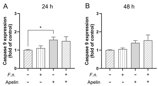 Effects of F. nucleatum (OD660: 0.025) and/or apelin (1 ng/ml) on the expression of caspase 9 at 24 h (A) and 48 h (B). A minus sign indicates the absence of F. nucleatum or apelin, whereas a plus sign indicates the presence of F. nucleatum or apelin. Untreated cells served as control. * significant (p < 0.05) difference between groups.