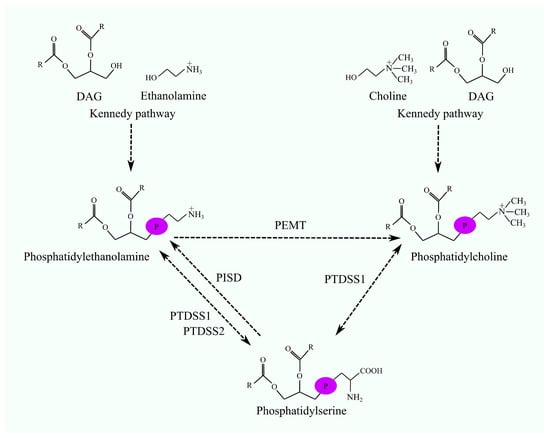 The Kennedy pathway does not synthesize other phospholipids; these are produced via alternative pathways. For instance, phosphatidylserine (PS) is synthesized from PC or PE through the exchange of choline or ethanolamine with serine. The enzymes catalyzing this reaction are phosphatidylserine synthase (PTDSS)1 and PTDSS2 [7,8]. Phospholipid composition can also be modified through other phospholipid conversion reactions (Figure 1). An example is the methylation of ethanolamine in PE by phosphatidylethanolamine N-methyltransferase (PEMT), resulting in the formation of PC from PE [9,10,11]. Additionally, serine in PS can undergo decarboxylation to produce PE, catalyzed by phosphatidylserine decarboxylase (PISD/PSD) [12].