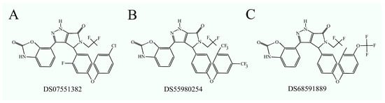 Figure 3. Structural formulas of PTDSS1 inhibitors: (A) DS07551382, (B) DS55980254, and (C) DS68591889.