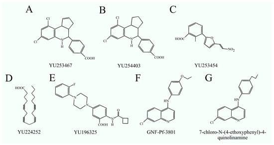 Figure 4. Structural formulas of PISD inhibitors: (A) YU253467, (B) YU254403, (C) YU253454, (D) YU224252, (E) YU196325, (F) GNF-Pf-3801, and (G) 7-chloro-N-(4-ethoxyphenyl)-4-quinolinamine.
