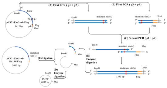 Construction of Eno2 mutant protein expression plasmid. A two-step PCR method was used to generate the expression plasmid, with the mutation of aspartic acid (D) to serine (S) at position 419 (Eno2-[D419S]) as an example. Four primers (p1 to p4) were used for the PCR, where p1 and p4 represent the forward and reverse flanking primers of the eno2 fragment, and p2 and p3 are complementary mutagenic primers carrying the mutation sequence. The plasmid pCS2-Eno2-wb- Flag containing the mouse eno2 gene fused with a Flag reporter gene and with wobble-modified nucleotides (wb) was used as the template in the first PCR step. Primers p1 and p2 were used to produce the upstream fragment of the gene containing the mutation site (X), while p3 and p4 were used to produce the downstream fragment. In the second PCR step, the products from the first step were mixed, and a small amount of p1 and p4 primers were added to generate the complete mutant gene fragment. After PCR completion, the mutant gene fragment and the pCS2 plasmid were digested with EcoRI and XhoI restriction enzymes to produce sticky-ended inserts and vectors. Finally, the insert and vector were ligated to create the pCS2-derived expression plasmid for the Eno2 mutant protein fused with the Flag reporter gene. Blue color: eno2 cDNA; orange color: reporter Flag; red color: mutation site; grey color: plasmid pCS2+ backbone.