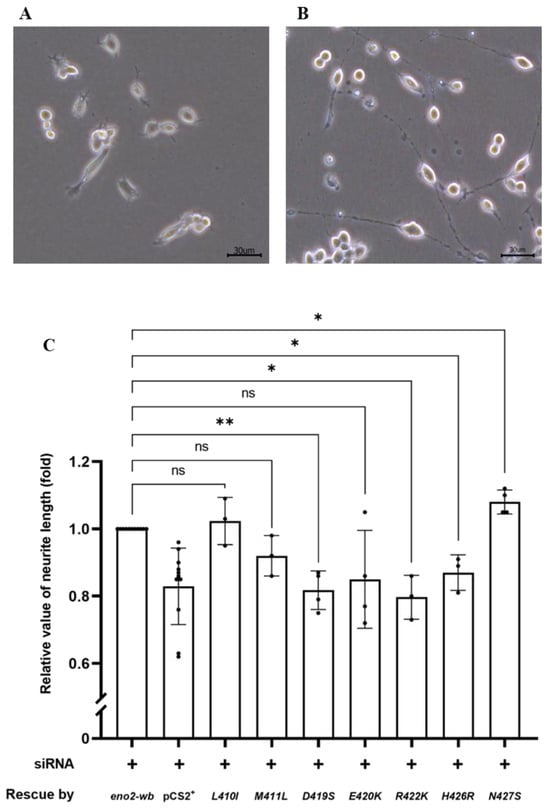 The effect of various point mutations in Eno2 on promoting the neurite growth of motor neurons. (A,B) Morphological differentiation of cultured NSC34 neural cells: (A) one-day incubation; (B) five-day incubation. Axonal neurites derived from cultured NSC34 cells were observed, and the neurite length was measured. (C) Statistical analysis of the average length of neurites. NSC34 cells transfected with siRNA (pCS2+) to inhibit endogenous mouse eno2 served as a negative control. After transfection with eno2 siRNA, eno2 DNA with modified wobble-nucleotides (eno2-wb) was transfected in NSC34. The resultant neurite length was normalized to a value of 1.0, which served as the positive control. The average neurite length of motor neurons was measured after transfection with siRNA, followed by transfection with plasmid harboring different point-mutated eno2-wb DNA. The fold change in neurite length was calculated relative to the positive control set as 1.0. Then, each experimental group was independently compared with the control group using t-test for statistical analysis (* p < 0.05, ** p < 0.01; ns indicates no significant difference). The t values and degrees of freedom for groups of -[L410I], -[M411L], -[D419S], -[E420K], -[R422K], -[H426R] and -[N427S] were 0.5754 and 2, 2.309 and 2, 6.362 and 3, 2.064 and 3, 5.413 and 2, 4.255 and 2, and 4.496 and 3, respectively.