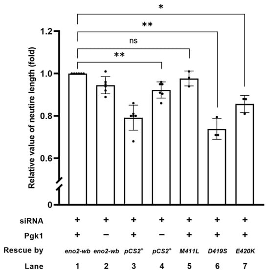 - Neurite length developed from eno2-siRNA-transfected NSC34 cells transfected by plasmid encoding Eno2-mutants in the presence of ePgk1