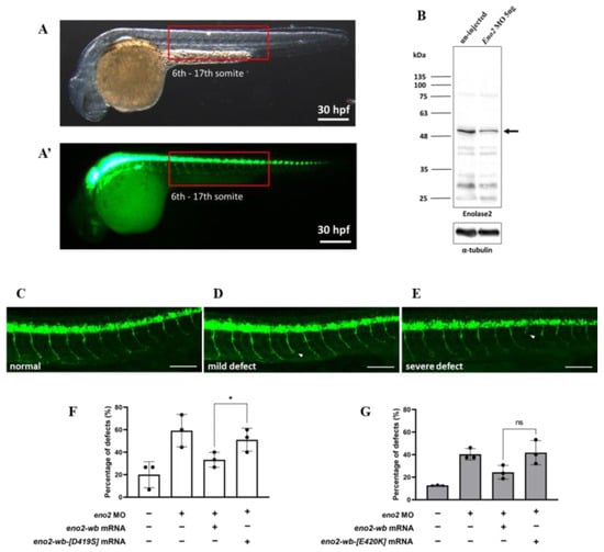 A rescue experiment was performed by microinjection of zebrafish eno2-wb mRNA or its mutated eno2-wb mRNA into eno2-MO-knockdown embryos. After microinjection, the occurrence of defective phenotypes was counted and a percentage calculated. To obtain figures from whole larvae (Figure 5A,A’), a Leica M205 FCA (objective: 1×, Leica, Wetzlar, Germany) fluorescence anatomical microscope was used, while a Leica TCS SP8 (objective: 10×, Leica, Wetzlar, Germany) confocal microscope was used for obtaining detailed images (Figure 5C–E).
