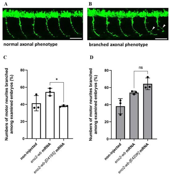 We followed the protocol described by Fu et al. [22], with the modification that mouse eno2-wb, eno2-wb-[D419S], and eno2-wb-[E420K] mRNAs were microinjected into the MO-treated zebrafish embryos. At 6 h post-injection, the embryos were immersed in Pgk1-Flag recombinant protein for 24 h. The neurite branching of motor neurons from 6th to 17th somites of 30-hpf embryos was then observed using an inverted fluorescence microscope (Olympus IX71, objective: 40×, Olympus, Tokyo, Japan). Neurites without branches were classified as having a normal axonal phenotype. The branched axonal phenotype was defined as neurite branching that only occurred at the central part of each axon, excluding the upper and lower fifths of each axon. The neurite branching rate was based on the number of embryos with branched neurites out of the total examined embryos. To obtain detailed images (Figure 6A,B), we used a Leica TCS SP8 (objective: 20×, Leica, Wetzlar, Germany) confocal microscope.