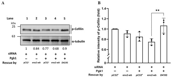 Using Western blot to analyze the level of phosphorylated Cofilin (p-Cofilin) expressed in NSC34 cells. (A) Western blot analysis. NSC34 cells were transfected with eno2-siRNA to knock down endogenous Eno2, then rescued with different DNA material, as indicated, in the absence (−) or presence (+) of Pgk1 protein. pCS+: plasmid with an siRNA insertion; eno2-wb: wild type Eno2 but consisting of nucleotides modified at wobble position (eno2-wb) to avoid being blocked by introducing siRNA; and D419S: mutant Eno2-wb consisting of an aspartic acid mutated into serine at the 419th position of Eno2. The expressional level of p-Cofilin at Ser3 was quantified relative to that of α-Tubulin, which served as an internal control. The number listed below each lane indicates the fold change of the p-Cofilin intensity of each treatment compared to the control group, set as 1. (B) Quantitative and statistical analyses. Data were averaged from three independent experiments and presented as mean ± SD (n = 3). One-way ANOVA, followed by Tukey’s multiple comparison test, was used to perform statistical analysis (** p < 0.005). F statistics were 4 as numerator and 10 as denominator.