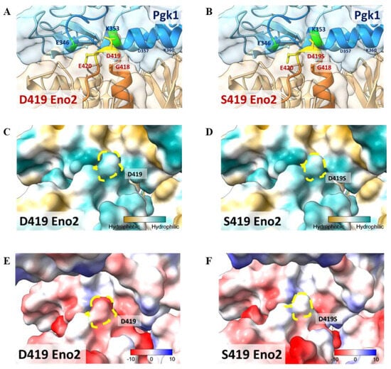 This study has established that D419 of Eno2 is a key amino acid and that Eno2-Pgk1 interaction fails to rescue the Eno2-[D419S] mutant. To construct a model to illustrate these findings, we performed a molecular docking analysis of the interaction between Eno2 (PDB ID: 5TD9, orange) and Pgk1 (PDB ID: 2ZGV, blue). Based on the docking model shown in Figure 8A,B, we found that D419 and E420 residues of Eno2 (yellow region) were two amino acids located on the surface of Eno2 close to the interface between Eno2 and Pgk1. Additionally, D419 and E420 of Eno2, two negatively charged amino acids, were the most adjacent residues able to interact with the 325th–417th domain of Pgk1, a positively charged segment forming an α-helix secondary structure (Figure 8A). It also showed that the surface-exposed amino acids of Pgk1 near the Eno2 region included E346, A349, K353, and D357 (Figure 8A), and that the interacting counterpart amino acids of Eno2-D419 and -E420 were Pgk1-K353 and -F346, respectively (Figure 8A). Interestingly, compared to the Eno2-[D419S] interacted with Pgk1-[K353], the side chain of mutated Eno2-S419 was altered (highlighted in yellow, Figure 8A vs. Figure 8B), suggesting the surface charge attraction between Eno2 and Pgk1 might become weaker.