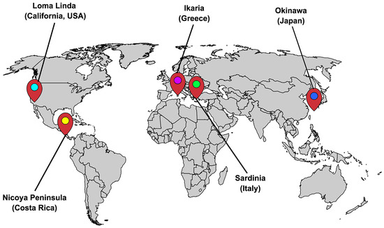 Additionally, studies from Wake Forest University [153] and the Exercise and Nutritional Interventions for Neurocognitive Health Enhancement (ENLIGHTEN Randomized Clinical Trial) [154] have further explored the synergistic effects of dietary interventions and physical activity, showing improvements in cognitive function across diverse populations. Insights from the “Blue Zones”—regions renowned for the exceptional longevity of their populations, including Okinawa in Japan, Sardinia in Italy, Loma Linda in California, United States, Nicoya in Costa Rica, and Icaria in Greece—highlight the influence of lifestyle factors on health and longevity [155,156]. Despite the geographical differences among Blue Zones—some being islands, others hilly or remote, and some surprisingly urban—these areas share key commonalities [157]. Figure 1 is a geographic map indicating the five Blue Zones. While the concept of Blue Zones has gained widespread attention for highlighting regions where people reportedly live longer, some experts question its validity [158].