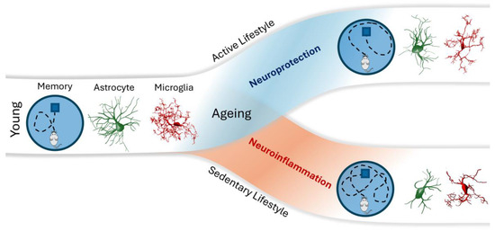 Impact of aging on memory, astrocytes, and microglia, highlighting the contrasting effects of an active versus sedentary lifestyle. On the left, the “Young” state is depicted, where memory function, astrocytes (green), and microglia (red) are in a healthy, balanced state. As aging progresses, the path diverges based on lifestyle: Active Lifestyle (upper blue path): An active lifestyle promotes neuroprotection, helping preserve memory function, maintain healthy astrocyte and microglial function, and mitigate the detrimental effects of aging. Sedentary Lifestyle (lower red path): A sedentary lifestyle leads to neuroinflammation, impairing memory, dysregulating astrocyte function, and activating microglia in ways that exacerbate neurodegenerative processes.