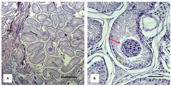 At the clinical examination, Brutus showed a generally good state of nutrition. The external genitalia showed a normal vulva in terms of position, shape, and size; the vulvar lips showed inflammation and excoriation of the skin part caused by the patient’s continuous licking of the area. The labia could not close the vulvar opening due to the presence and protrusion of the penile structure. The penis, containing the penile bone, showed a dry, inflamed, and eroded surface due to the lack of skin covering and protection. There were no abnormalities in the course of the internal urethra and the external part of the organ connected to the external sphincter located on the dorsal face of the body of the penis. The internal genitalia, investigated by second-level diagnostic means (ultrasound and computed tomography), showed two compact intra-abdominal parenchymatous structures connected to two cavitary organs referred to as uterine horns (Appendix A). Following laparoscopic surgery to remove the intra-abdominal organs, histological analysis showed testicular parenchyma presenting seminiferous tubules with undeveloped germinal epithelium and Sertoli cells with nucleated nuclei and no mature spermatozoa (Figure 1).