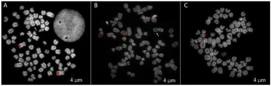 Cytogenetic analyses were performed by fixing metaphase spreads onto slides and then incubated at 90 °C for 1 h 30′ to contribute to sample fixation and dehydration. The 0.005% pepsin/HCl 0.01 M treatments were performed to eliminate cytoplasm proteins for better hybridization rates. Subsequent treatments in PBS 1×, MgCl2 0.5 M, 8% paraformaldehyde, and 70%/90%/absolute alcohols allowed proper stabilization, fixation, and dehydration of metaphases and nuclei DNA molecules. In situ fluorescence hybridization (FISH) experiments were performed on nuclei and metaphases using probes from a female canine BAC CHORI-82 library (https://bacpacresources.org/library.php?id=253 (accessed on 27 September 2024)) and human RP11 BAC library (Table 2).