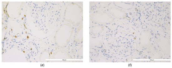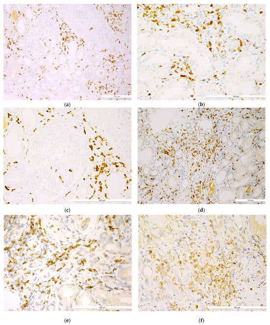 Lupus nephritis with (a) well-represented periglomerular and interstitial CD8+ T lymphocytes (IHC, anti-CD8, ×20); (b) CD8+ T lymphocytes in the renal interstitial area (IHC, anti-CD8, ×40); (c) CD8+ T lymphocytes with concentric periglomerular localization (IHC, anti-CD8, ×40); (d) CD8+ T lymphocytes in the periglomerular area (IHC, anti-CD8, ×5); (e) well-represented interstitial CD8+ T lymphocytes (IHC, anti-CD8, ×40); (f) CD8+ T lymphocytes with a tendency to form nodules (IHC, anti-CD8, ×40). The bars indicate a size of 100 µm.