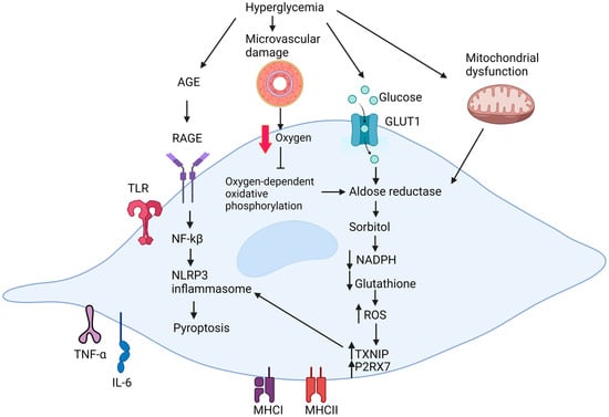 In diabetic Schwann cells, stress stimuli such as AGEs and HMGB1 activate the RAGE and TLR-4 signaling pathways, promoting the nuclear translocation of NF-κB and the subsequent priming of the NLRP3 inflammasome. In addition, endoplasmic reticulum (ER) stress, mitochondrial damage, and increased ROS generation [109,110], driven by the hyperactivity of the polyol pathway, elevate thioredoxin-interacting protein (TXNIP) activity, and TXNIP binds to NLRP3 protein and activates the inflammasome pathway [111,112]. In addition, the excessive activation of P2RX7, another consequence of ROS overproduction, also acts as a parallel signaling for NLRP3 inflammasome activation [107]. P2RX7 is a purinergic P2 receptor that can be activated by high concentrations of extracellular adenosine 5′-triphosphate (ATP) in various pathogenic conditions, such as nerve injury [113], diabetes, and depression [114]. Increased inflammasome activity leads to Schwann cell death through pyroptosis [107].