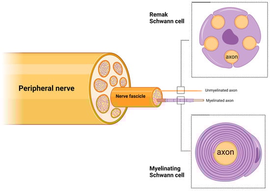 The organization of Remak Schwann cells and myelinating Schwann cells in peripheral nerves. Created with BioRender.com.